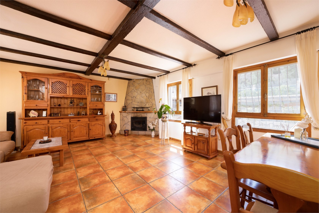 Salón-comedor con chimenea, espacioso y acogedor. Perfecto para reuniones familiares, cenas con amigos o una tarde de película. Las grandes ventanas inundan la estancia de luz y permiten el acceso directo al exterior.